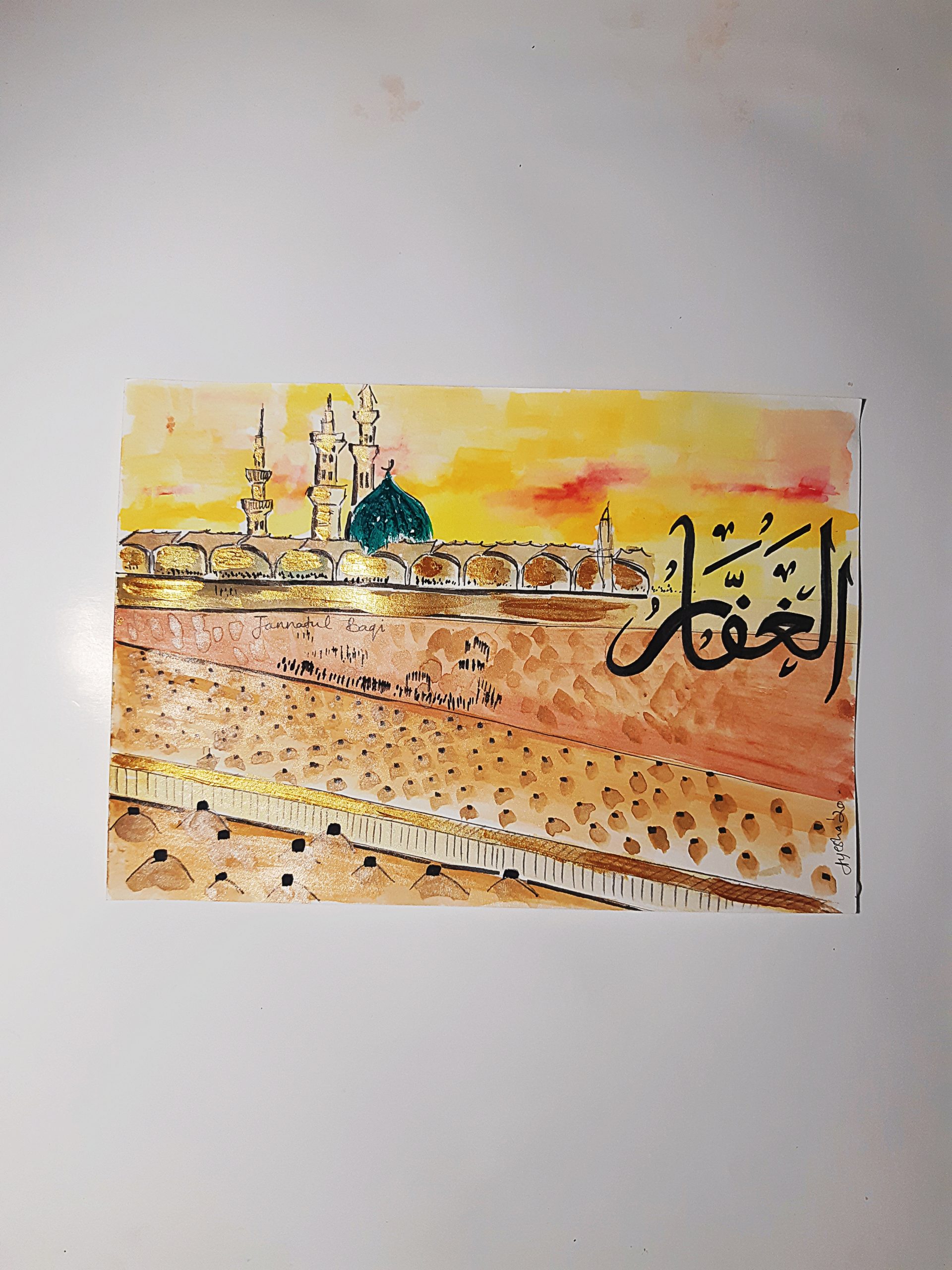 The Prophet’s (Pbuh) mosque, painted with a warm piercing sky on 300 gsm, rich golds, and a textured serene dome, overlooking Jannatul Baqi, in Madina alongside God’s beautiful name, Al Ghafaar, the All Forgiving Lord.